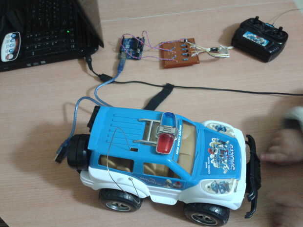 Empecé con un simple código que recibe datos desde el puerto serie de Arduino y se mueve el coche por consiguiente. He asignado una letra para cada comando: lo elegido "F" para el delantero, "B" para posterior, "R" para el comando adecuado y "L" para el comando izquierdo y "S" para la parada. Cuando Arduino recibe una carta desde el PC, el comando correspondiente es enviado al transmisor. PIN 11 de arduino está conectado con el comando hacia adelante en el transmisor (J2), pin 10 al al revés (J1), pin 13 a la derecha (J4) y pin 12 a la izquierda (J3).