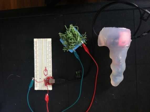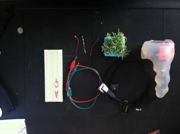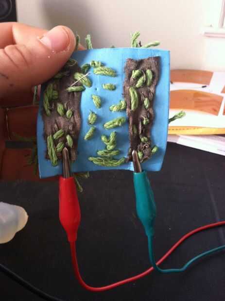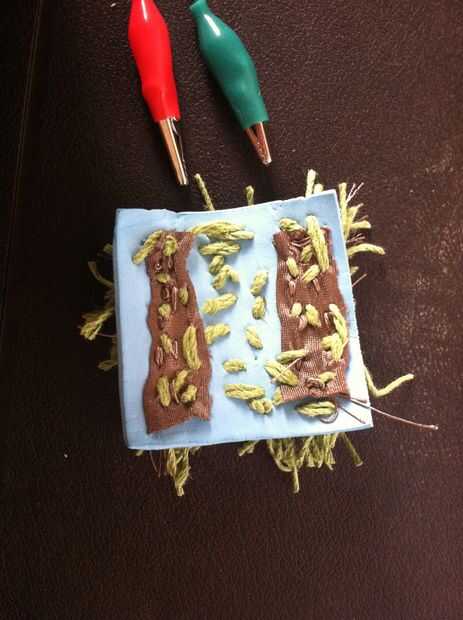 Coloque dos pinzas a cada lado del dispositivo de detección. Asegúrese de que los clips hagan contacto con la tela conductora. Ponga esta pieza a un lado, va a utilizarlo nuevo muy pronto!
