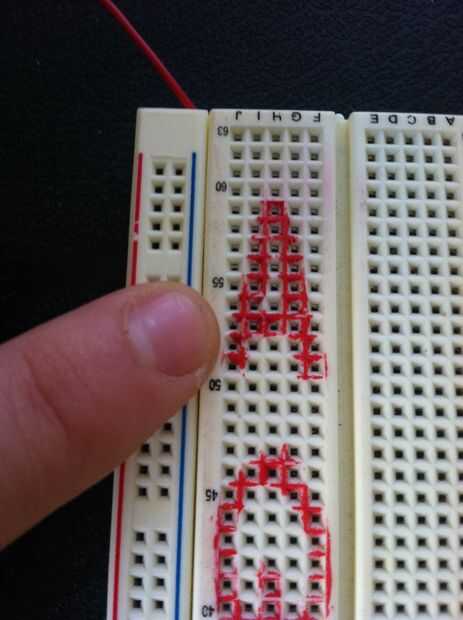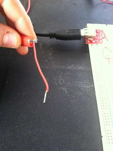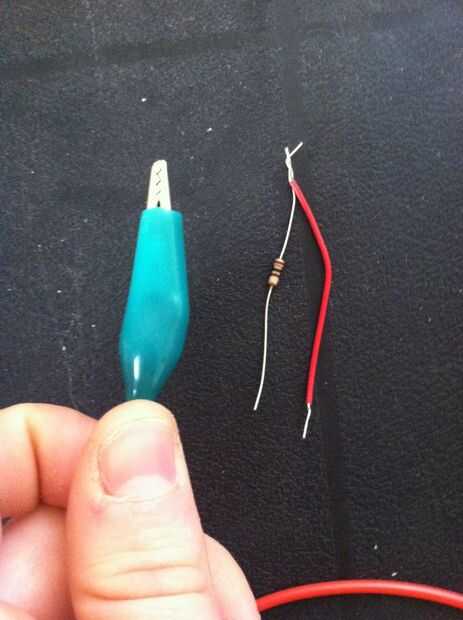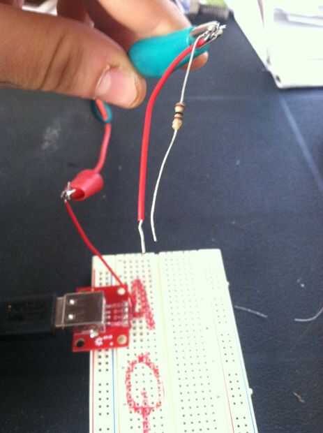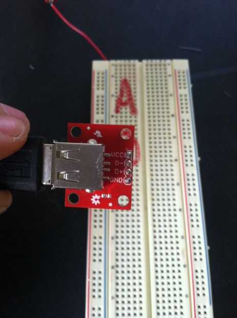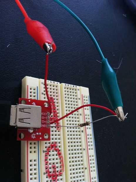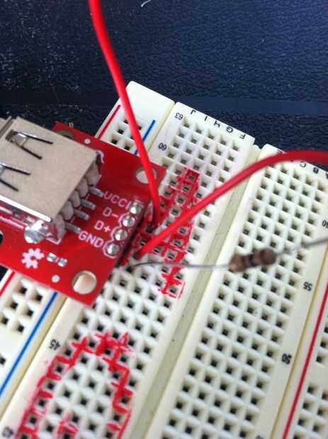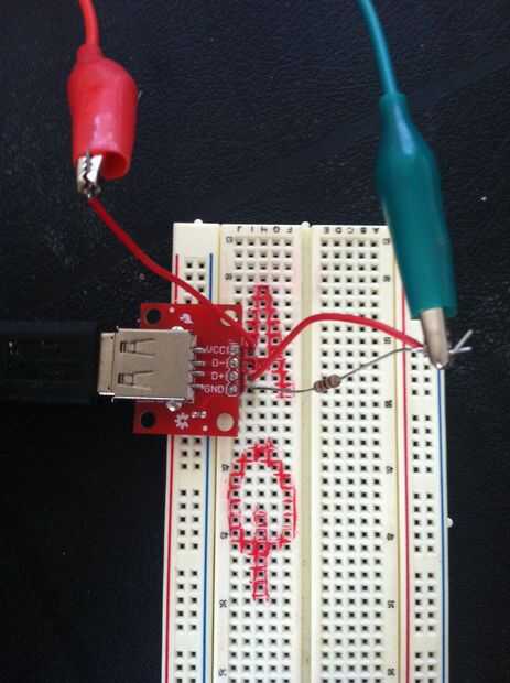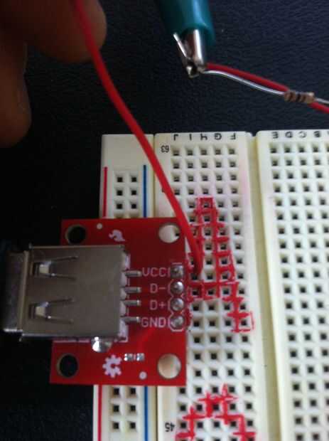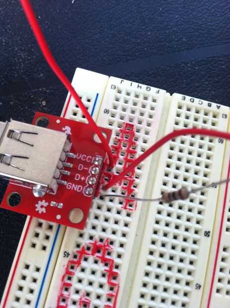 Tomar la placa breakout y montaje en la parte superior de tu protoboard. A continuación, tomará uno de sus extremo pinzas de cocodrilo y clip en uno de los cables firmemente. Entonces se tome ese cable conectado e inserte en el protoboard, correspondiente VCC de la Junta de arranque. Siguiente, tomar su segundo Cocodrilo clip y conecte el cable restante y la resistencia. Luego se inserte su resistencia en el alambre en D + y GND.