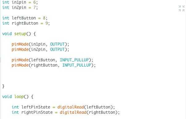 int in1pin = 6;int in2pin = 7; // h bridge pinsint leftButton = 8; int rightButton = 9; // buttonsvoid setup() { pinMode(in1pin, OUTPUT); pinMode(in2pin, OUTPUT); // outputs pinMode(leftButton, INPUT_PULLUP); pinMode(rightButton, INPUT_PULLUP); // inputs w internal pullup resistors }void loop() { int leftPinState = digitalRead(leftButton); int rightPinState = digitalRead(rightButton); // set value names for read data if (leftPinState == LOW) { // if left button is pressed ... digitalWrite(in1pin, HIGH); // make motor go one way digitalWrite(in2pin, LOW); } else if (rightPinState == LOW) { // if right button is pressed ... digitalWrite(in1pin, LOW); digitalWrite(in2pin, HIGH); // make motor go other way } else { // if neither button is pressed ... digitalWrite(in1pin, LOW); // nothing happens digitalWrite(in2pin, LOW); } }