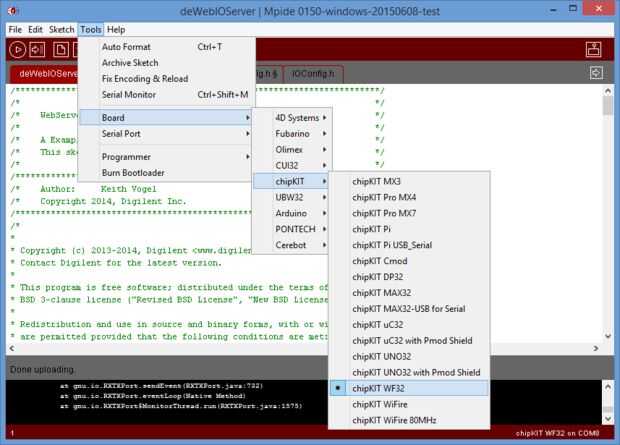 En fin de todo para subir correctamente, tenemos que asegúrese de que el «Consejo» en MPIDE es a WF32. En este caso, una imagen vale 1 mil palabras. Revisa la fotografía para ver donde cambiar la Junta a WF32.