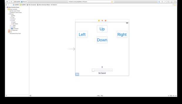 "Up" "Down", "Izquierda" y "Derecha" son botones, mientras que "0" y "Set Speed" son etiquetas. Incluimos también un control deslizante y una vista de la Web. No te olvides de agregar las restricciones que falta para que los elementos encajen correctamente en la pantalla del dispositivo iOS.