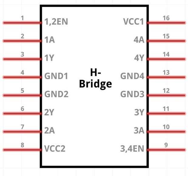 Los pines 1 y 9 se usan para activar los motores. Pines 2 y 7 cambian la dirección de un motor, mientras que los pines 10 y 15 cambian la dirección del otro motor. Estos pines deben estar conectado a una salida de PWM para controlar la velocidad de los motores.