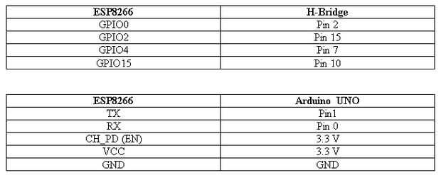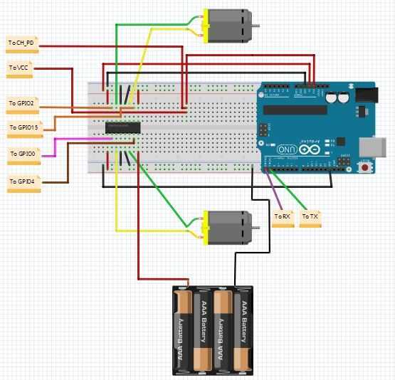 Por suerte el ESP-12GPIOs pueden producir señales PWM para que puedas elegir cualquier cuatro GPIOs del módulo. Decidimos utilizar GPIOs 0, 2, 4 y 15. Pines 3 y 6 conectan a uno de los motores, mientras los pines 11 y 14 se conectan a la otra. Pines 4, 5, 12 y 13 se conecta a tierra. Pin 8 se utiliza para los motores con una fuente externa de energía. Este pin está conectado al borne positivo de las baterías 4-AA, que proveen ~ 6V. Puede utilizar un máximo de 36 V. Pin 16 se utiliza para la alimentación de la lógica de IC.