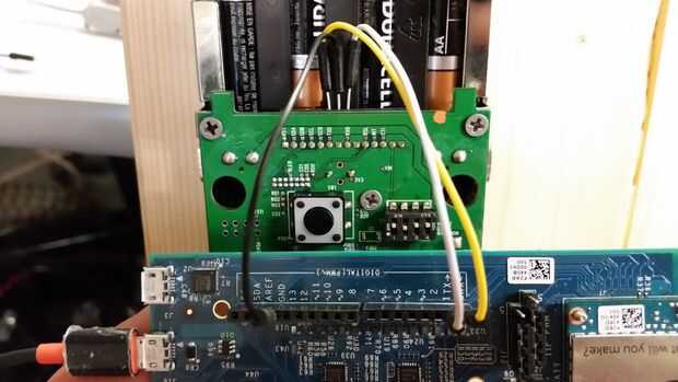 Opcionalmente, puede alimentar a su Edison de una batería de 9V. Encontramos que con WiFi, una batería de 9V estándar dura aproximadamente una hora.