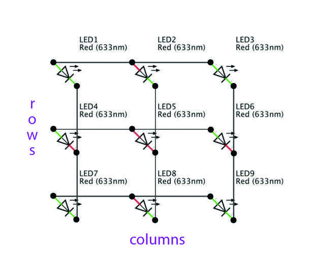 Una matriz de LED es una colección de LEDs, pueden ser arregladas en muchos patrones, el más típico es una sola línea, o un patrón de matriz. Aquí cubrimos el patrón de la matriz. Una matriz define un cuadrado o rectangular que consiste de intersección de filas y columnas. La intersección de estas filas y columnas son importantes cómo nos hable con la matriz y dirección LEDs individuales.