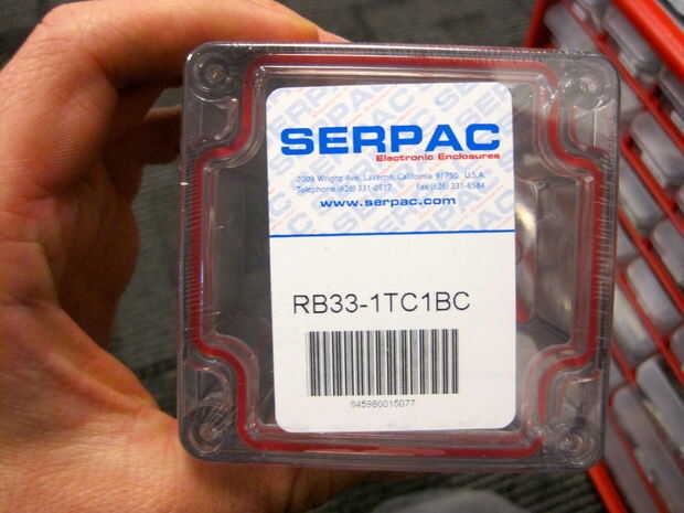 - Un recinto. Debe ser suficientemente grande para contener un imp + breakout Junta, batería (1,25 "x 2.25") y lo suficientemente profundo para mantener los contenidos antes mencionados y dejar espacio para la base de un potenciómetro. Utilicé una caja Serpac RB33-1TC1BC , que es cerca de 1.9" de profundo, pero usted puede conseguir lejos con aproximadamente 1.6" de profundidad.