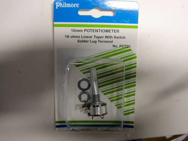 - Un potenciómetro de 5 k ohmios y 1 k ohmios. Obtener un potenciómetro lineal, no una logarítmica. Mina incluye un interruptor (que quede bien cuando vuelva a todos el camino hacia la izquierda), e incorporé en mi firmware. Te recomiendo buscar uno con un interruptor, pero no es esencial. Sólo útil.