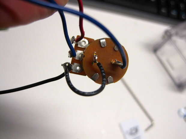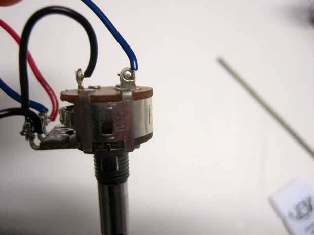 - Utilizando la misma técnica que hemos utilizado en soldar cables a las asas del potenciómetro en el primer paso, soldar un extremo del cable azul a la terminal superior en la parte posterior del cuerpo de potenciómetro.