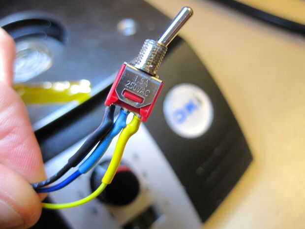 En primer lugar, vamos a poner algunos cables en el interruptor. Un interruptor SPDT simplemente selecciona entre dos conexiones: para cada posición del interruptor, es una conexión y una conexión está desactivada. El pasador central está siempre conectado; el interruptor selecciona cuál de las dos clavijas exteriores está conectado a. Tres colores de los cables es otra vez una buena idea para conseguir confundido. Utilicé cable azul para el centro de amarillo para un lado y negro por el otro lado.