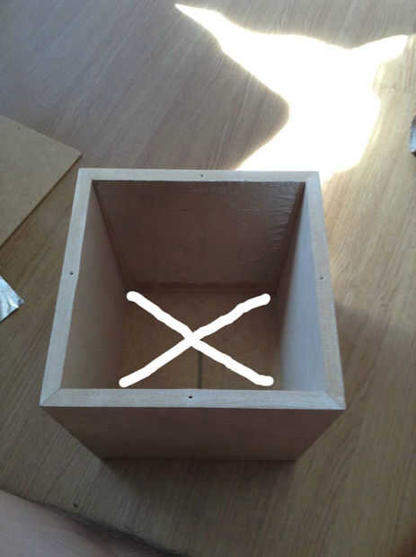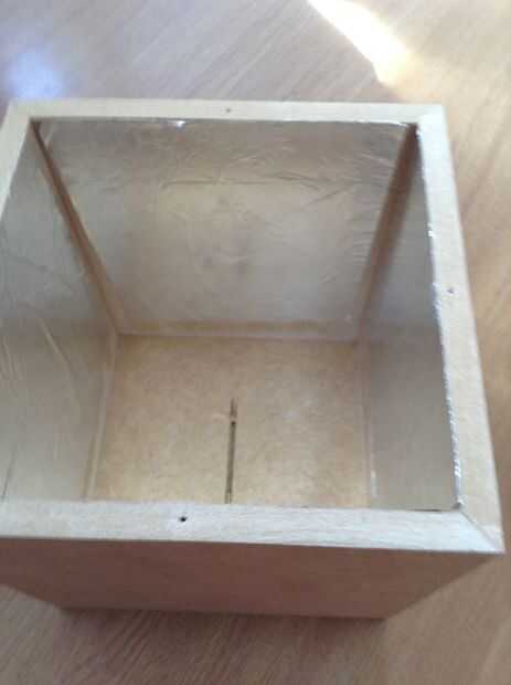 Recorte 4 quadrados de papel alumínio, um pouco menores hacen un área interna da caixa (para não haja conato entre os aluminios). Então, cole-os nas caras internas da caixa.