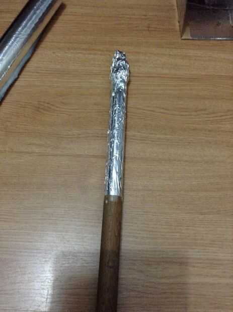 3 corte pedaços grandes de papel aluminio. Umm para cobrir una ponta do cabo da vassoura, servirá para direcionar o personagem, conjunto em com una caixa.