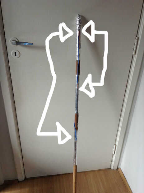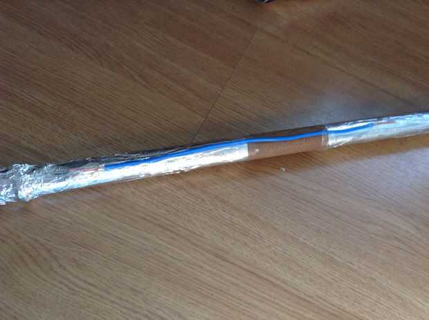 Después certificar-se essas partes expostas dos fios estão em contato direto com o alumínio, durex de com grude. Cuidado com o durex utilizado para grudar o papel alumínio no cabo da vassoura!