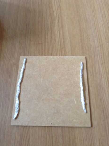 Depois, cole na parte de baixo um pedaço de papel alumínio e grude um pedaço de papel alumínio amassado, conforme una imagem.