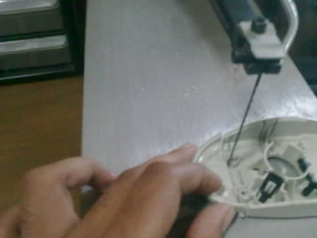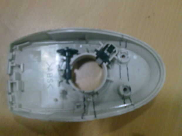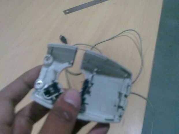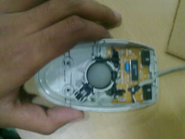El ratón tiene dos rodillos. Tenemos que conectar un engranaje para el rodillo de x, tal que el equipo conducirá su eje es decir, el cursor cuando se mueve el engranaje. Para acomodar el engranaje de la rueda tenemos que cortar una porción bajo el rodillo de x. Echa un vistazo a las fotos de las líneas marcadas en el cual un corte debe ser hecho. Cortar sólo la parte que bloquea el engranaje, corte excesivo de la carcasa del ratón a debilitarlo.