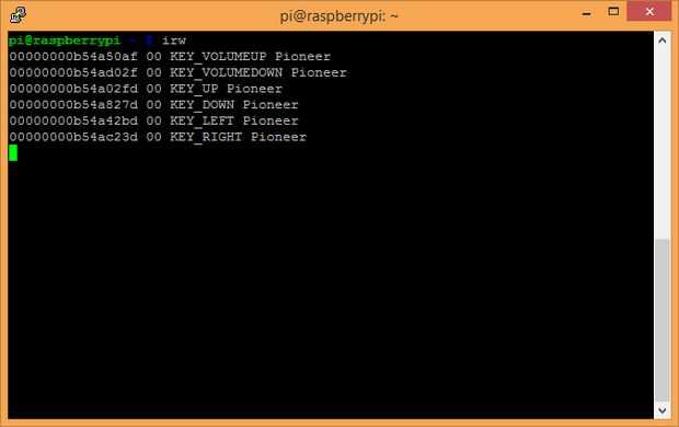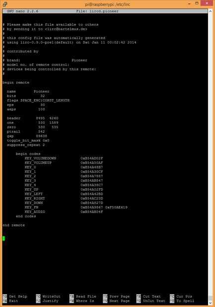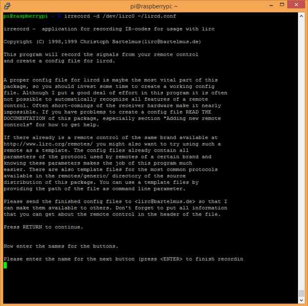 Le llevará a través de algunas raras pero detalladas instrucciones. Seguirlos y terminarás con un archivo de configuración que almacena señales de infrarrojos para cada botón. Puede ver con: