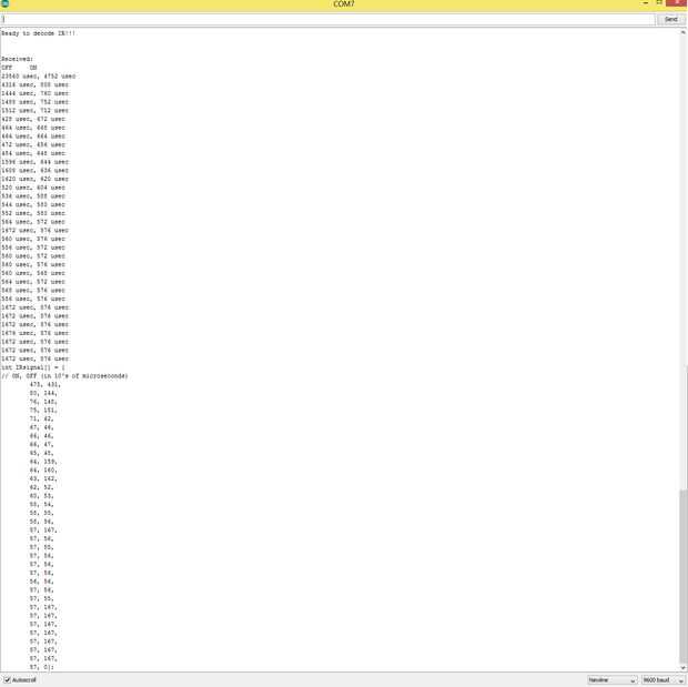 El primer bloque de códigos es los valores del crudo tiempo en microsegundos, el segundo es los mismos valores dividido por 10 y presenta en forma de una matriz C, por lo que podemos usarlo directamente en el código de Arduino (que usaremos mientras se recrea la señal IR). Observe que las columnas valor crudo son OFF-ON y los valores con formato son ON-OFF. El primer valor de datos en bruto (1234 usec) es inútil, ya que es la medida de tiempo que no hubo signal(OFF) antes de que empezamos a recibir en primera señal (por lo que no aparece en los valores de formato). En los valores con formato como una matriz, último valor será siempre 0 en el último extremo sólo de la voluntad de duración al pulsar un botón del control remoto nuevo.
