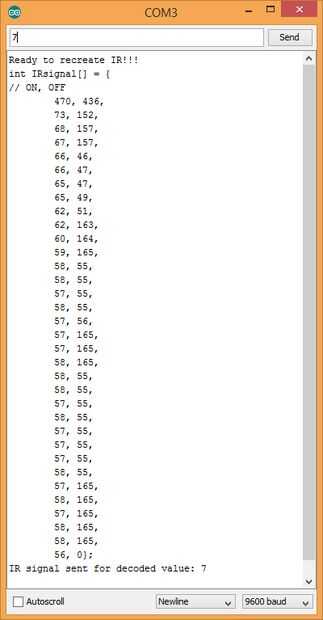 El sketch de arduino conectado te espera enviar el valor decodificado del botón que quieres emular y envía la señal de IR para él. Recuerde ajustar línea terminando en el monitor serial como 'Nueva línea'.