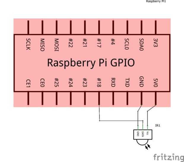 Conecte un receptor IR a su frambuesa Pi como se muestra. Sensor de infrarrojos tiene que conectarse a 3, 3V en lugar de 5V. Nos estamos conectando el pin de datos del sensor IR al Pin 18 del Raspberrty Pi.