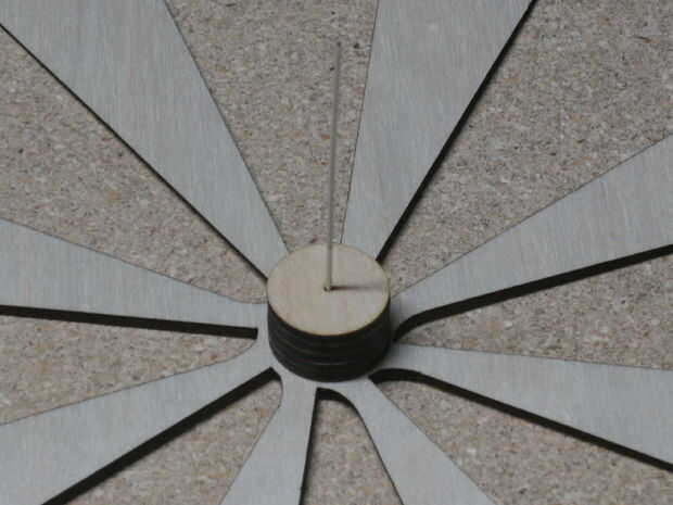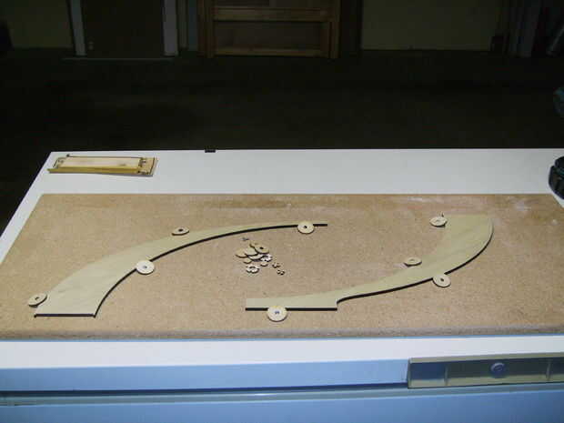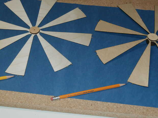 se trata de una escultura cinética que hice, usando principalmente 1/4" espesor madera contrachapada y el pasador. Funciona con una manivela para mover un mecanismo de árbol de levas-como que hace presión sobre las palancas, que levanta los brazos d
