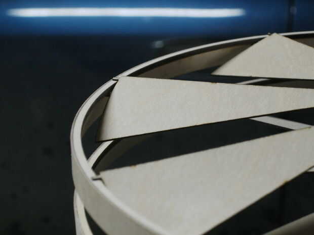 Las láminas de rotor se salga delgada y muy flexible. Para montarlos yo torcido simplemente cada hoja para bloquear las dos lengüetas en el 1/8" anillo de madera contrachapada, una ficha sobre el anillo, una pestaña bajo. Lo espejo reflejada las palas del rotor por lo que sería girar en direcciones opuestas. La tensión los mantiene en su lugar, no se necesita pegamento.