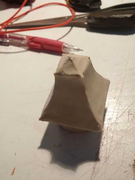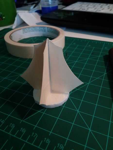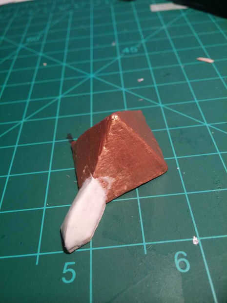 El diamante se hace mediante la creación de una impresión azul de 3-d con una cinta planas trozos de papel juntos para hacer la forma general (foto 1, 5 y 6). Arcilla seca aire es añadido en rellenar los espacios vacíos, secado, lijar luego cubierto de mod podge (foto 1). Una forma de gota de lágrima se añade (foto 3) y arcilla es alisada en pellizcando tus dedos juntos y frotada para crear una columna (foto 4). Esto es demasiado había cubierto de pegamento y pintado (foto 2). El pomo está hecho de una manera similar. Hice el plan 3-d en primer lugar y con cinta el papel junto con un círculo de espuma por debajo (foto 5 y 6). Para ver hasta dónde iría el pasador en el pomo pongo el pvc en el tang y poner el plano de abducción hasta la clavija que sobresale. Se hace una marca donde la espiga debe terminar en el pomo y un espacio se corta fuera de los planos 3-d. El plano de abducción se coloca en la espiga y arcilla se utiliza para cubrir el espacio, dejando un espacio donde puede Deslice la espiga. La arcilla entonces se seca, lijar, cubierta de pegamento y pintar una capa de base negra (Pic 7). El espacio cortado previamente en la empuñadura ahora puede ser rellena con arcilla seca de aire, pero asegúrese de que colocar el diamante donde debe estar por lo que se sabe que la arcilla necesita y va no interferir con la colocación de diamond.