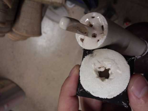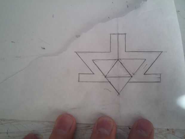 Ahora puede tomar la PVC y use el madera pegamento para adherir el tubo de PVC hasta el cuello (foto 1). Si hay un espacio vacío entre el resto de la espiga y el final de la tarta de PVC, de completar con restos de madera y un poco de pegamento. Exprima un poco de pegamento en el hueco del pomo y el área en el PVC que hará contacto con el pomo y ponerlos juntos (foto 2). Espere a que el pegamento se seque. Ahora cubrir el diamante con mod podge y coloque en la hoja para que quede en el área que usted hizo para él. Tome un pedazo de papel y trazar la forma de la pieza octogonal sobre ella y dibujar el diseño de la Trifuerza (foto 3). Coloque este papel en la hoja y suavemente ir sobre ella con un lápiz varias veces, que esto dejará poco profundos surcos en la superficie como si fue grabado en él (foto 4).