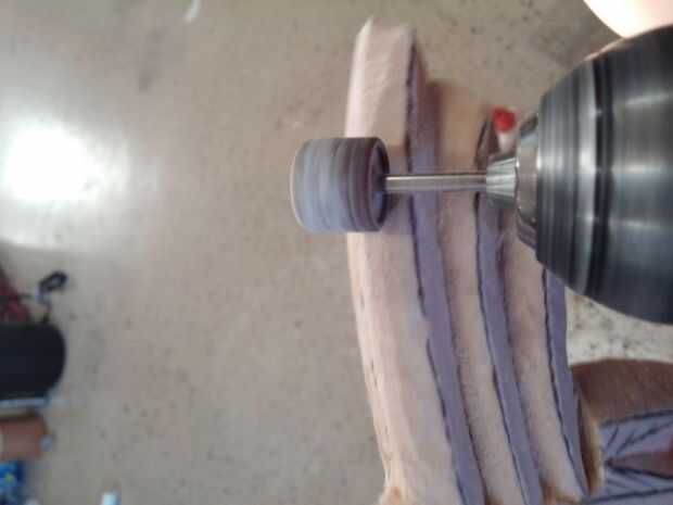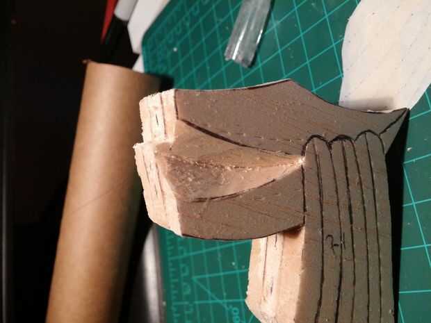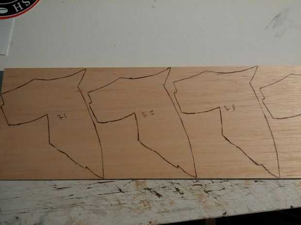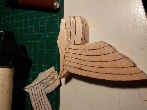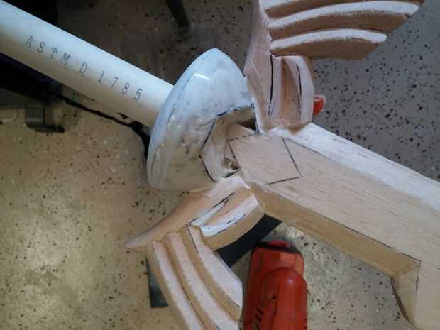 Las alas en el plano son corte y trazadas 3 veces para cada ala en la última hoja de balsa (foto 1). Pega estas juntos y recortar los lados para que queden al ras uno con el otro. Luego puede meter pequeños agujeros a lo largo de las líneas de detalle en su plano a la madera y conectar los puntos con un lápiz (foto 2). Entonces remontar la línea media a lo largo de las alas (foto 3), así que ya sabes donde parar la talla cuando biselar los bordes. Las partes donde las alas tienen una muesca son hechas por cortar una astilla en el medio, seguido por recortar hasta la línea que se detiene en la (foto 4 y 5). La parte redonda que une las alas hasta el cuello entonces biselados hacia abajo, pero a diferencia de los bordes de la hoja debe permanecer redondeados. Arena las alas hasta que estén suaves (foto 6). Para ensamblar las alas al cuerpo, tomó seis palillos de dientes, cortar por la mitad y apuñaló a la parte del ala donde conecta con el cuerpo de la espada. Los escarbadientes luego voltea alrededor y pegados en su lugar. Cuando se haya secado el pegamento, pegamento de madera debe ser repartida liberalmente las partes de las alas y el cuerpo de la hoja que se conectan. Limpie cualquier exprime hacia fuera cuando los dos se presionan juntos (foto 7 y 8). Toda la pieza es cubierta entonces en varias capas de una mezcla agua y pegamento de madera (Foto 9 y 10). La primera capa es una 2 parte de agua a 1 parte cola mezcla una después de que un poco más de pegamento se agrega a la mezcla. El pegamento se remoja en la madera y creó un tipo de exterior duro, pero sigue siendo frágil.