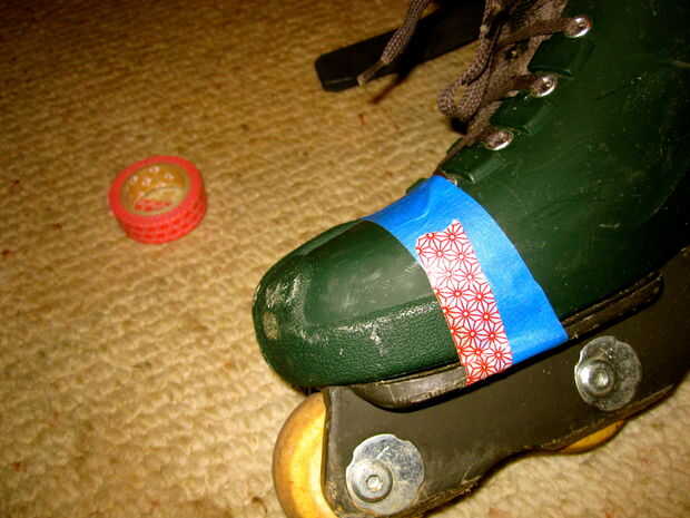 Todo el mundo sabe la punta blanca y los ornamentos son la firma de la mirada de zapatillas Converse, así que esto es un paso muy importante! El cuidado más que tomar para hacer su cinta mienten directamente y en el patrón de la zapatilla, mejor serán los resultados. Usé cinta de pintor azul, luego más fino modelado cinta (con equivalente pegajosa y la prueba de agua-ness) para hacer las líneas más exacta.