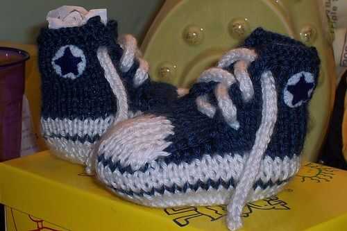 Regalo pequeño perfecto para mi pronto sobrino. Zapatos de bebé que no parecen botitas de bebé, pero más bien poco corte Converse zapatos. Esperamos que disfrute de tejerles tanto como lo hice.