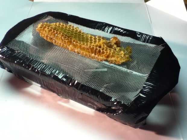 Después de haber hecho el filtro puede poner un trozo de panal en la parte superior el alambre de pollo y luego comenzar a calefacción/fusión con secador de pelo. Solo pones rebanada del panal después de loncha en el filtro (mientras se lava de vez en cuando) y mantener fusión les. Al final tienes algo de miel en la parte inferior de la jarra de cristal, cubierta con una capa de cera de abejas.