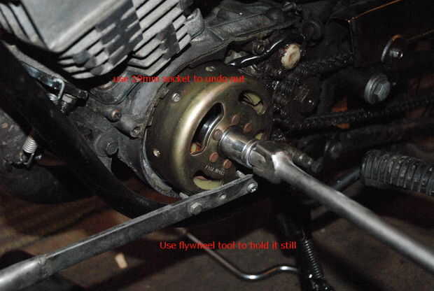 Aflojar el tornillo central grande de la rueda volante. Cuña de la herramienta de sujeción para sostener el volante todavía (o mantenerla) y deshacer el perno grande (conector de 19mm, una barra del triturador puede ayudar). Salir demasiado las dos arandelas y observe el orden que están en (tuerca, y arandela de resorte, entonces arandela plana por debajo). Si son difíciles de conseguir en, un imán en un palillo funciona un regalo aquí.