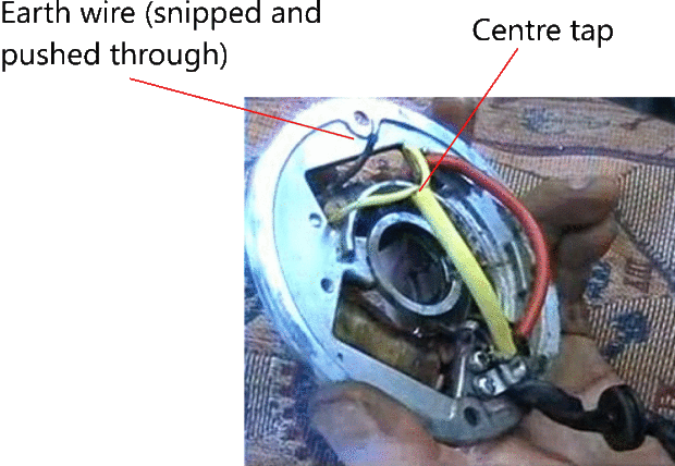 Cortar el alambre de tierra negra en la parte delantera del estator y pasar a la parte posterior. Esta soldadura para el cable amarillo que solía ir al grifo del centro. Nuevamente, cubra la junta con cinta adhesiva o termo retráctil.