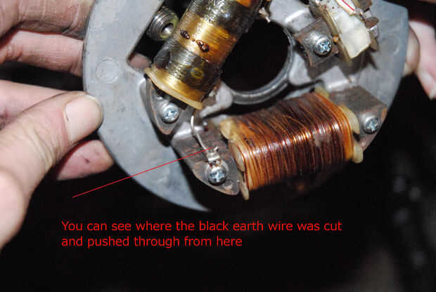 Originalmente en el RXS esta bobina hace dos trabajos: carga la batería de 6v y corre parte del circuito de iluminación mediante el grifo de centro (como una pequeña bobina extra redondo la mitad de la bobina). Qué vamos a hacer es usar la bobina entera, en lugar de sólo una parte de él, para cargar la batería y el sistema de iluminación se ejecute su batería. Esto significa que sus luces no dependen de la velocidad el motor gira - no más tenues luces en bajas revoluciones.