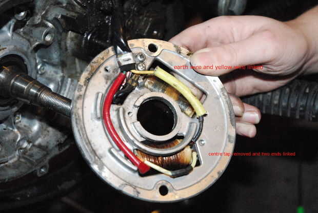 Vuelva a montar el estator/volante (Recuerde alinear la llave Woodruff con la ranura en el volante) y colocar la tapa. No olvidar las arandelas de la tuerca de la rueda volante (plana y arandela de resorte en la parte superior). Apriete la tuerca usar correctamente el volante con la herramienta para mantener todo en su lugar. Recuerde volver a conectar el cable neutro.