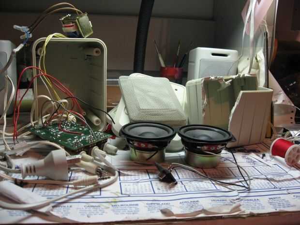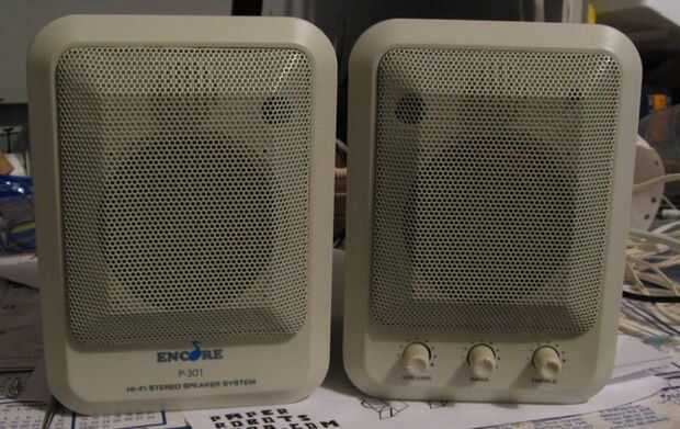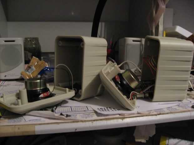 Primero tendrás que adquirir un par de altavoces viejos más fuente amplificador para poner dentro de su nueva unidad. Altavoces de la computadora son ideales ya que tienen su propia fuente de alimentación, amplificador, altavoces y son un diseño relativamente simple. Si usted puede conseguir algunos que tengan volumen, graves, agudas perillas, encendido/apagado interruptor y un LED, mejor aún. A través de cualquier medio necesario, quitar las vísceras de los altavoces y desechar el resto. Si desea puede guardar el poco meshy cubierta que puede verse decorativa más adelante en el proyecto. Puede ser necesario cortar algunos de los cables y resoldar para salir todo, sólo asegúrese de que usted recuerde que los cables van donde. No puedo estar molesto hacer esto así que hace poco de un desastre de la cáscara del altavoz y les había hackeado para arriba con un par de tijeras.