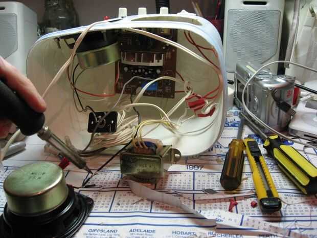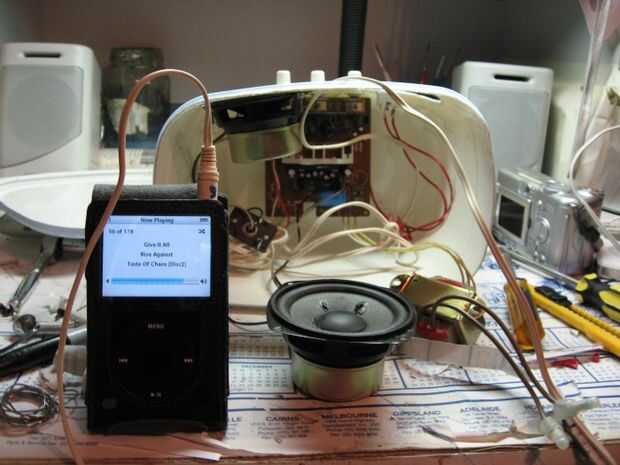 Cuando todo está conectado, conéctelo y asegúrese de que funciona. Si funciona, tornillo y arreglos de las partes restantes en la caja y empezar a añadir algunos toques finales. Si los altavoces cuentan con el transformador como mina te podría tener que compensar algún tipo de marco en la parte inferior del recipiente de detener movimiento. Solía simplemente Silastic para pegar al lado.