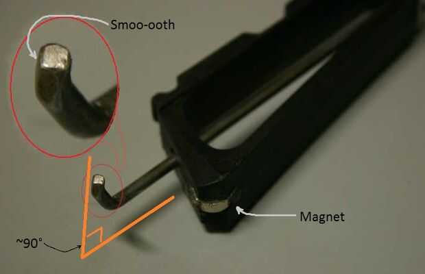 La varilla del disparador está doblada en un extremo como se muestra. El primero, más agudo, es por lo que se deduce el ángulo de la empuñadura de mano brazo de bomba; la segunda, poco profundas, cerca de la punta es para que la varilla del gatillo no tiene tendencia a deslizar hacia arriba o hacia abajo en el zapato del gatillo, que podría hacer el gatillo tire desagradable.