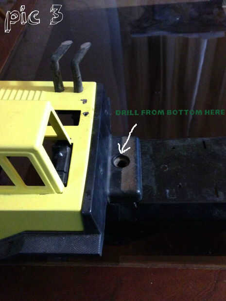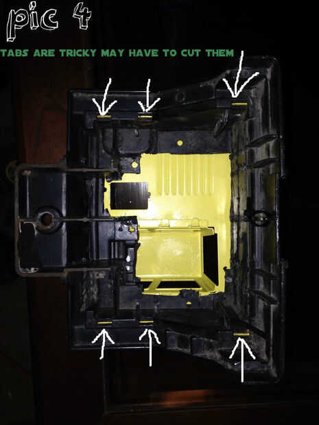 3) el taxi. Primero tienes que separar la parte metálica de la parte de plástico duro-a de la cabina. Para ello, hay seis clips del metal en la parte de la cabina se muestra en la figura 4 (Nota: la abrazadera metálica de cuatro son difíciles de eliminar. Te recomiendo cortar el centro y luego desplegar los clips... también buen lugar para almacenar las baterías).