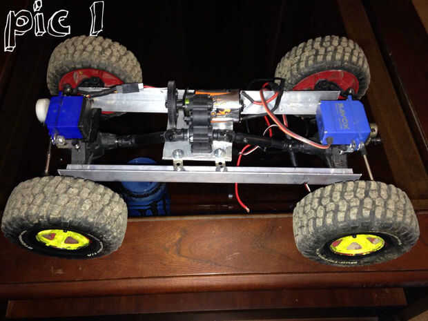 El chasis del balanceo que hice es conveniente para esta aplicación porque hace más fácil unir al carro, así como ajuste y centrado bien el neumático en la rueda. Básicamente consiste en dos 3/4 pulgadas x 96 pulgadas x 0,050 pulg. Aluminio grueso ángulo en 11 1/2 pulgadas de largo. como se muestra en la foto 1. Conectado en cada extremo del ángulo son dos Axial AXI30488 bloqueado eje conjunto AX10, en Amazon.com.