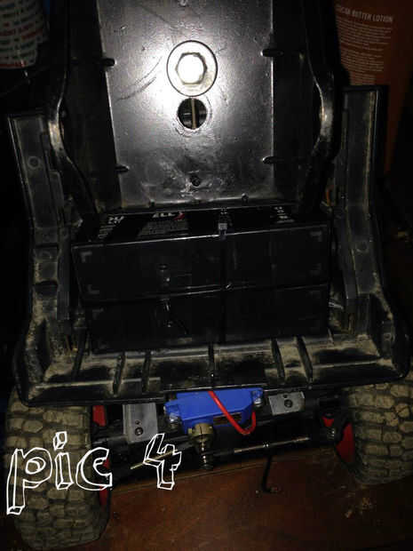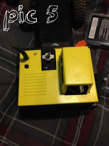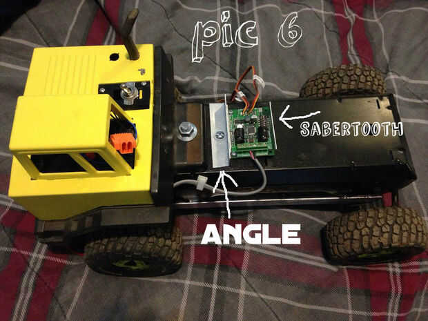 Añadí el interruptor on/off en la parte superior de la cabina y cuelga el cable de carga por la ventana para las baterías (en caso necesitan ser recargada) como se muestra en la figura 5. He añadido un trozo de ángulo detrás de la cabina y directamente detrás de eso he añadido mi conductor del Motor 12A Sabertooth Dual para R/C también se encuentra en Amazon.com. Tan cuando la cama baja, está sentado ligeramente por encima de él, como se muestra en la figura 6.