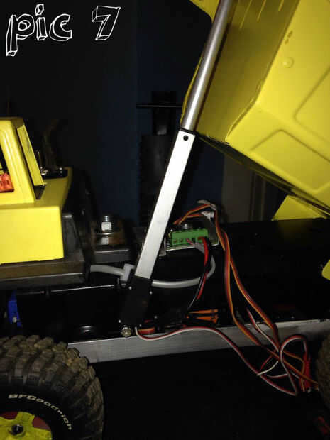He añadido mi 100mm Firgelli acuator 100: 1 cociente del engranaje, (que se encuentra en el sitio de Firgelli) con la varilla roscada en el lado del real cuerpo de Tonka (Nota: hice la varilla roscada tiempo suficiente en caso de desee agregar un segundo actuador (para aumentar la usabilidad y para cargas más pesadas de dumping) como se muestra en el cuadro 7. (Nota: yo no añadía la solar aún porque los elementos están en orden... Pero voy a actualizar cuando esté listo)