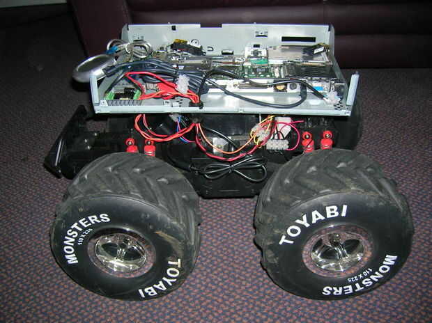 Un viejo decodificador satélite sirvió como el caso del proyecto y monta muy fácilmente a la parte superior del carro. Luego montado en el tablero de sistema y el controlador de Sabertooth adentro, junto con una batería de 12V 7AH SLA (colgada en la carcasa), convertidor DC-DC para el ordenador portátil de 12V y un a prueba de fallos.