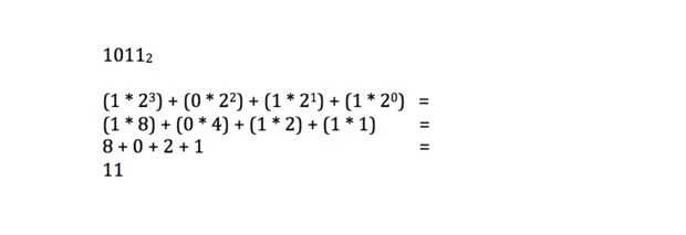 1011: aquí, el dígito 1 está en la posición 1. El valor de este dígito se ve como: 1 * 2 ^ 1 = 2.