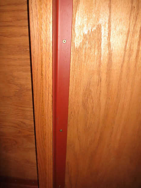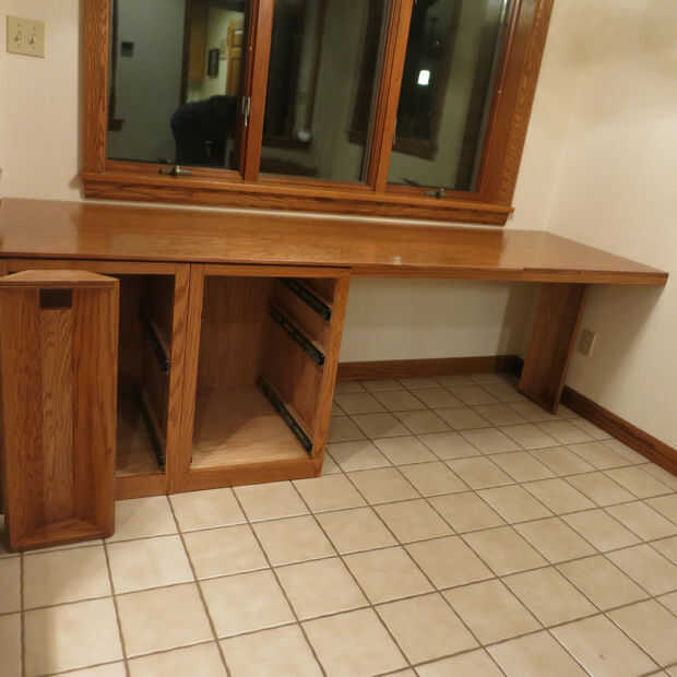 Queríamos fortalecer las dos secciones largo escritorio puesto que se soportar el peso de varias piezas de equipo de oficina, así que compré 2 piezas de 1-1/4 "x 1-1/4" x 1/8" del hierro de ángulo, cortar, pintar e instalado en el lugar en el interior borde de cada escritorio delantero del ajuste.