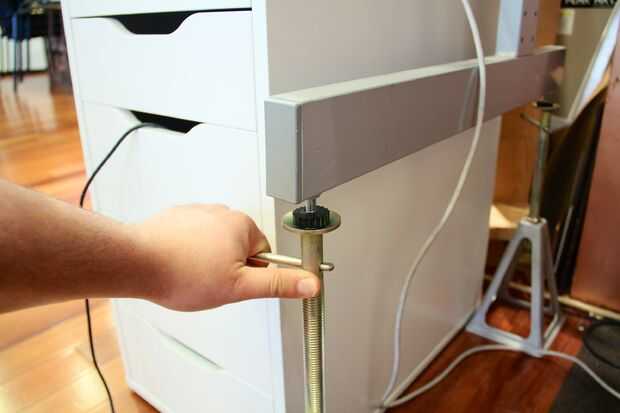 Usted puede obtener una vaga idea de qué tan alto debe toma su escritorio usando una simple calculadora de altura de escritorio aquí de pie. Así, usted puede ajustar las tomas más de la manera antes de ponerlos bajo su escritorio, por lo que sólo necesitará hacer algunos ajuste una vez que están en el lugar. Es mucho más rápido para alimentar varias pulgadas de una varilla roscada a través de las tuercas antes de usted plop su escritorio en la parte superior luego una vez el pesado escritorio.