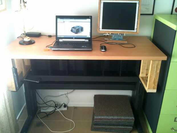 La base de esta conversión es hacer dos cuadros de la caja de madera del perno prisionero, destornille la parte superior del escritorio de la estructura y luego insertar los marcos de caja entre la mesa y el marco - fácil!