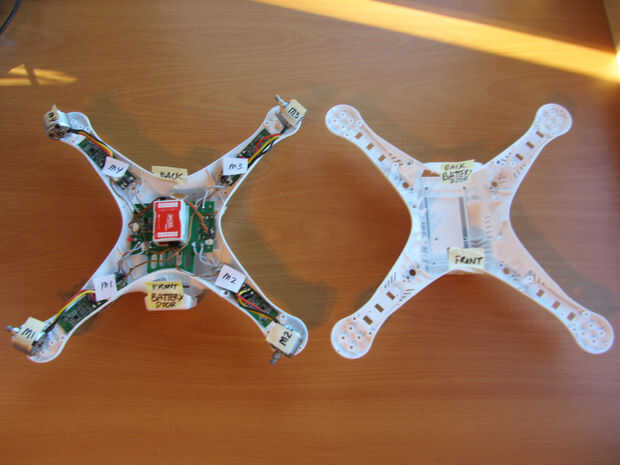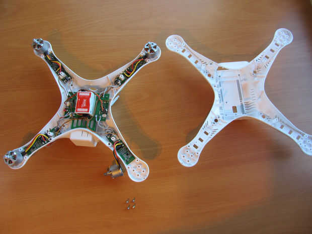 Hay 4 tornillos de cabeza hexagonal en cada uno de los motores. (Los cuatro tornillos que se muestran en la segunda foto. El destornillador afloja uno de la tornillos de cabeza hexagonal en la foto la cáscara.) Retire los pernos cabeza hexagonales 4 motor que asegure los motores, pero deje los motores descansando sobre cada brazo hasta que el resto de los componentes se hayan aflojado.