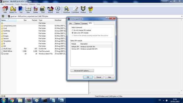 Ahora seleccionamos SFX. Haz clic en O.K. El archivo se guardará en la carpeta que estábamos usando. Ejecute el archivo. Tu exe está listo. Puede cambiar el logo del icono y otras cosas haciendo clic en opciones avanzadas en el menú SFX (ver imagen 3 º en este paso.)