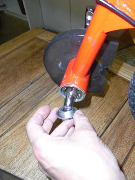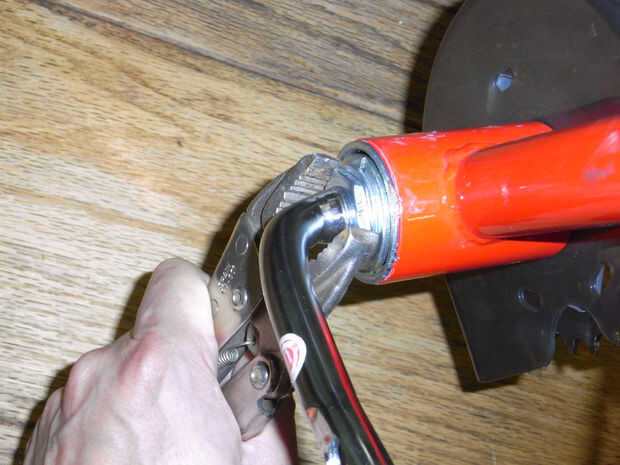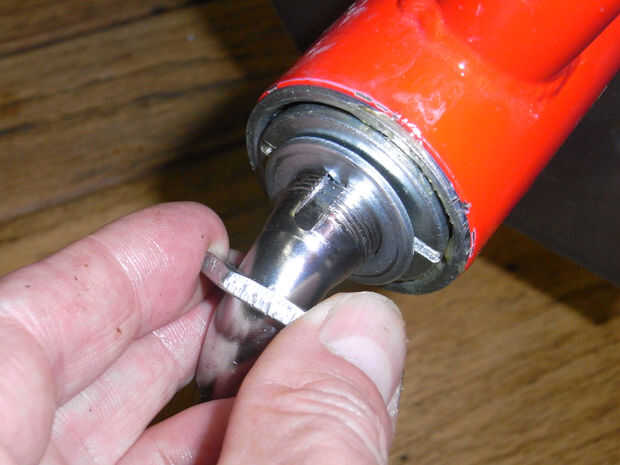 Para quitar, deshacer primero la tuerca de retención como se muestra. Debajo de esto se encuentra la raza de bola externo que debe ser desenroscada. En la foto puedes ver que esta es la parte con ranuras. Estos pueden utilizarse para dar compra con un destornillador si es necesario. Si aplica fuerza con un destornillador tenga cuidado y mantenga las manos fuera del camino.